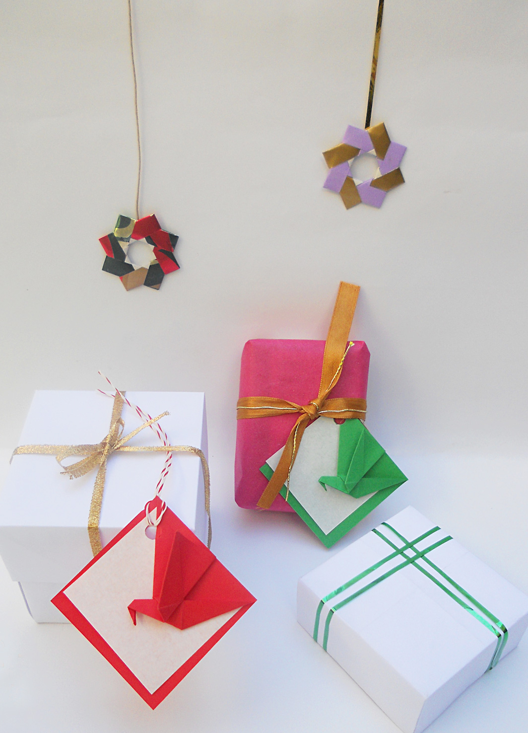 Están realizados en cartulina doble faz y papeles de regalo. La estrellita que corona los tres arbolitos es un diseño de Jun Mitani.